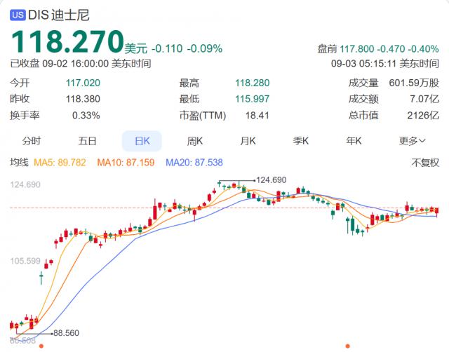 今年来,迪士尼股价一度大起大落,从年初 118 美元上方一度跌到 4 月初的最低点 83 美元,而后又在 7 月初涨到 124 美元,随后开始震荡调整。截至发稿,迪士尼盘前跌 0.4%,报 117.8 美元。