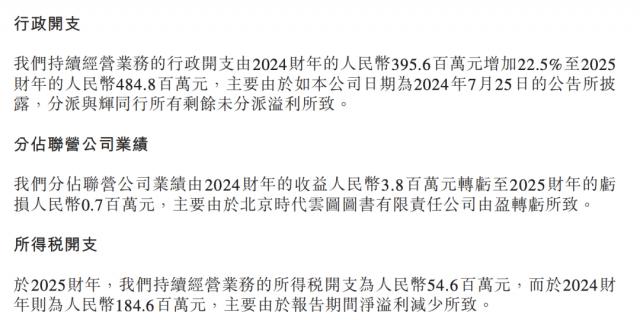 还有一个细节不能忽略。2025 财年的行政开支增加了 22.5%,达到 4.848 亿元。主要原因是公司在去年 7 月把"与辉同行"剩余未分派的溢利分了出去。此前,董宇辉离开东方甄选时,俞敏洪曾表示,将公司存留的 1.41 亿元净利润全部奖励给董宇辉,并将在财年报告中体现出来。