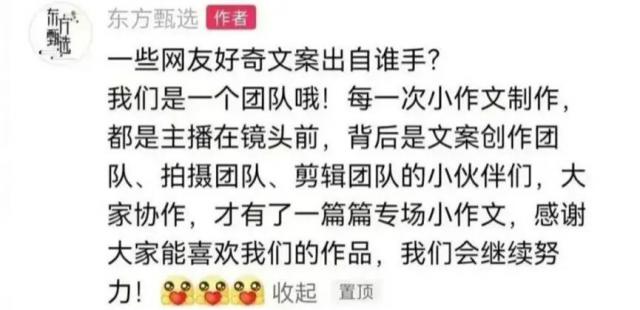 2023 年底的小作文风波,正是这种矛盾的集中爆发。2023 年 12 月 10 日,东方甄选小编在吉林带货预热视频的评论区称"每一次小作文制作,都是主播在镜头前,背后是文案创作团队 …… "粉丝们质疑,这意味着董宇辉并非小作文作者?小编回应:"董宇辉有时候也会写,但大多是文案团队完成。"